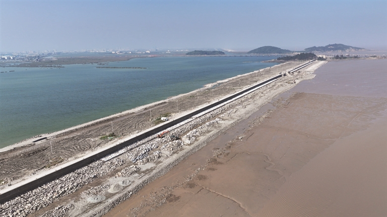 近日,在金清镇的一处海塘边,挖掘机忙着作业,加固海塘堤坝,提高防洪能力。